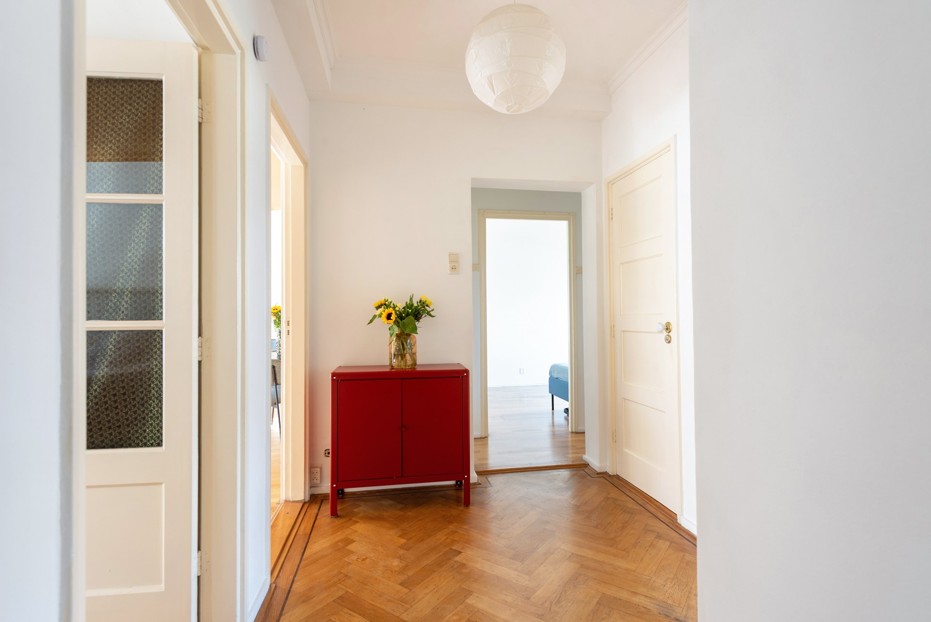 Vanuit de gezamenlijke entree op straatniveau, met brievenbus en bellentableau, leidt een portiek trap naar de eerste verdieping waar de eigen entree van het appartement zich bevindt. Entree appartement: u stapt binnen in een ruime L-vormige hal die toegang biedt tot alle vertrekken.